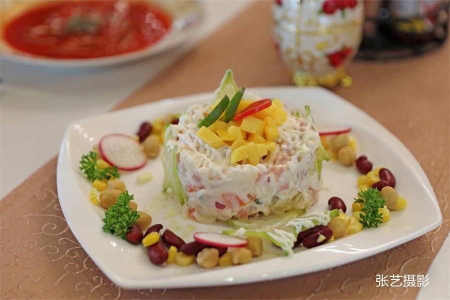 皇后沙拉是俄罗斯的一种传统沙拉,也是俄罗斯沙拉界的泰斗,发明者是19世纪60年代俄罗斯一家法餐厅的大厨。单从外观看,这道菜品尽显高贵典雅的气息,再加以食材配色手法,会散发着一种打开味蕾的诱惑。以沙丁鱼作为打底,依次放入土豆、胡萝ト和紫菜,再撒上俄罗斯特质的沙拉酱,以蛋黄作点缀,整体菜品看上去华丽又恰到好处。它层层叠叠的制作手法象征着“蒸蒸日上,层层高”的美好寓意! 也会颠覆大家对沙拉的认知,像个蛋糕,正确的吃法是搅拌均匀后,再用勺子舀着吃。
