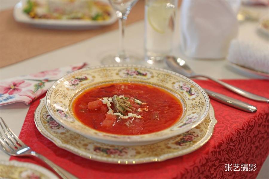 金环餐厅这道红菜罗宋汤在俄罗斯久负盛名而又平常普通。汤里主要有甜菜,通常还加有圆白菜、土豆、蘑菇等蔬菜和小肉块。罗宋汤有冷热之分,罗宋汤通常会在上面加上一球酸奶油,看起来十分诱人,喝起来酸酸甜甜的,味道很好!
