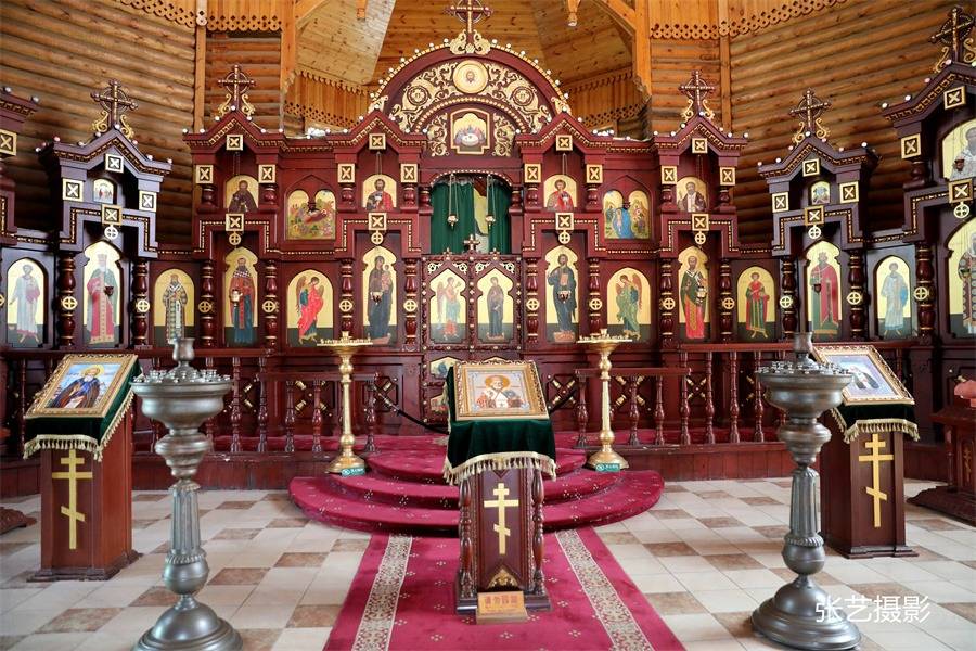 教堂的内部陈设都是按原比例制作的,请俄罗斯圣像画家绘画圣像。为了建教堂,庄园在俄罗斯进口了60多车皮的樟子松 。复建后的教堂建筑是"尼古拉教堂艺术馆“。