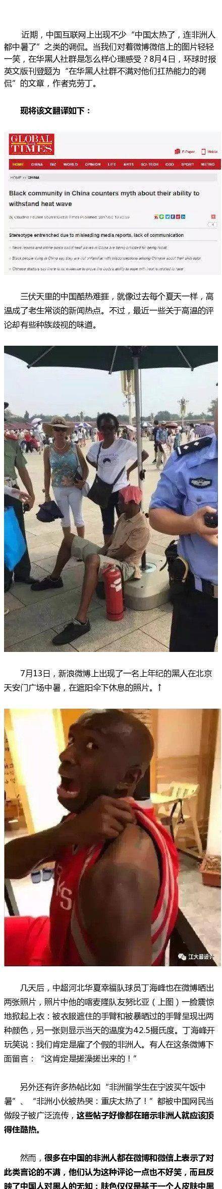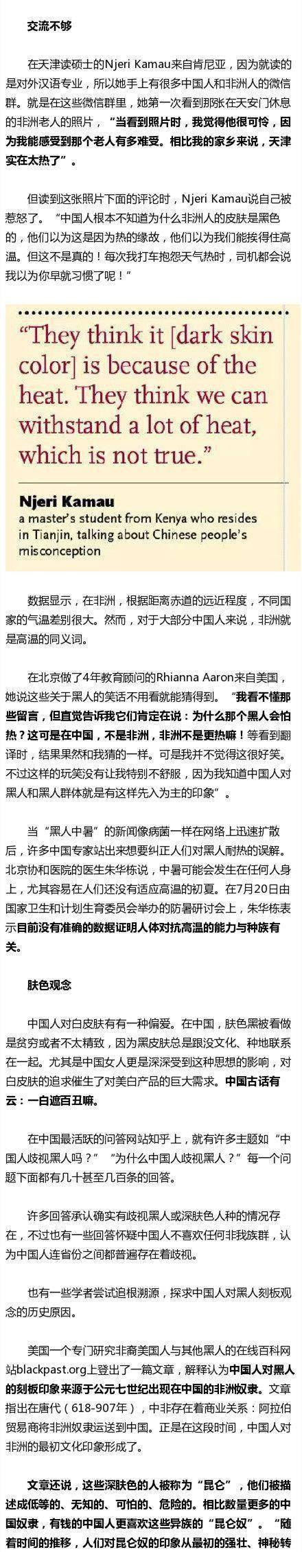 9,想多了,黑人想多了我可以理解,但某些国人也能联想这么多,我只能呵呵了。中国人对人种没有歧视,只是对某些不当行为或者不当文化有歧视,怕热的问题仅仅是调侃,调侃的对象并非黑人,而是我们的天气。