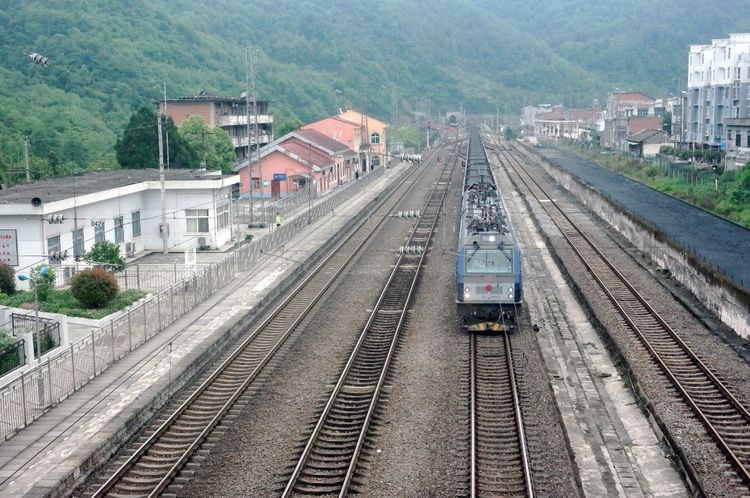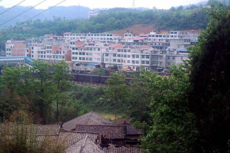 ▼大竹园镇就在山脚下,一列货车正在缓慢通过大竹园火车站