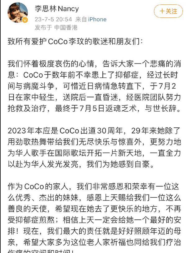 李玟去世的消息震惊娱乐圈,家人和经纪公司也证实了这一消息。很多艺人都将他视为偶像,纷纷发信息悼念他。消息一出,引起社会各界轰动。