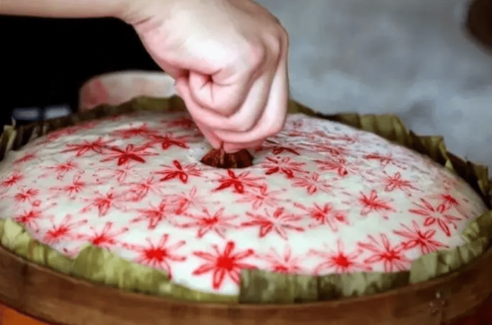 待半笼发至满笼,直到出现细密针孔,则可取一些小竹棒均匀插在每一个蒸笼的内壁,以确保发糕的表面不会被损坏,竹竿大约每笼四到五根。