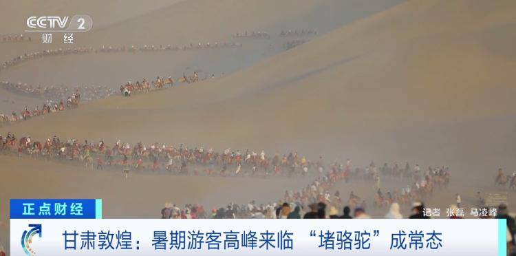 记者在敦煌的鸣沙山月牙泉景区看到,随着暑期到来,当地的旅游人数也在不断攀升。游客骑着骆驼,沿着鸣沙山脚下穿行,场面显得十分壮观。