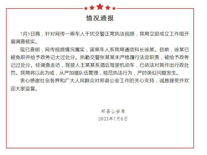 现已查明,网传视频情况属实,该乘车人系郏县公安局通信科长徐某。目前,徐某已被免职并给予政务记大过处分。执勤交警张某某未严格履行法定职责,被给予政务记过处分。经调查走访,驾驶人王某某系酒后驾驶机动车,已依法对其作出行政处罚。郏县公安局将以此为戒,从严加强队伍管理,规范执法行为,严防类似问题发生。