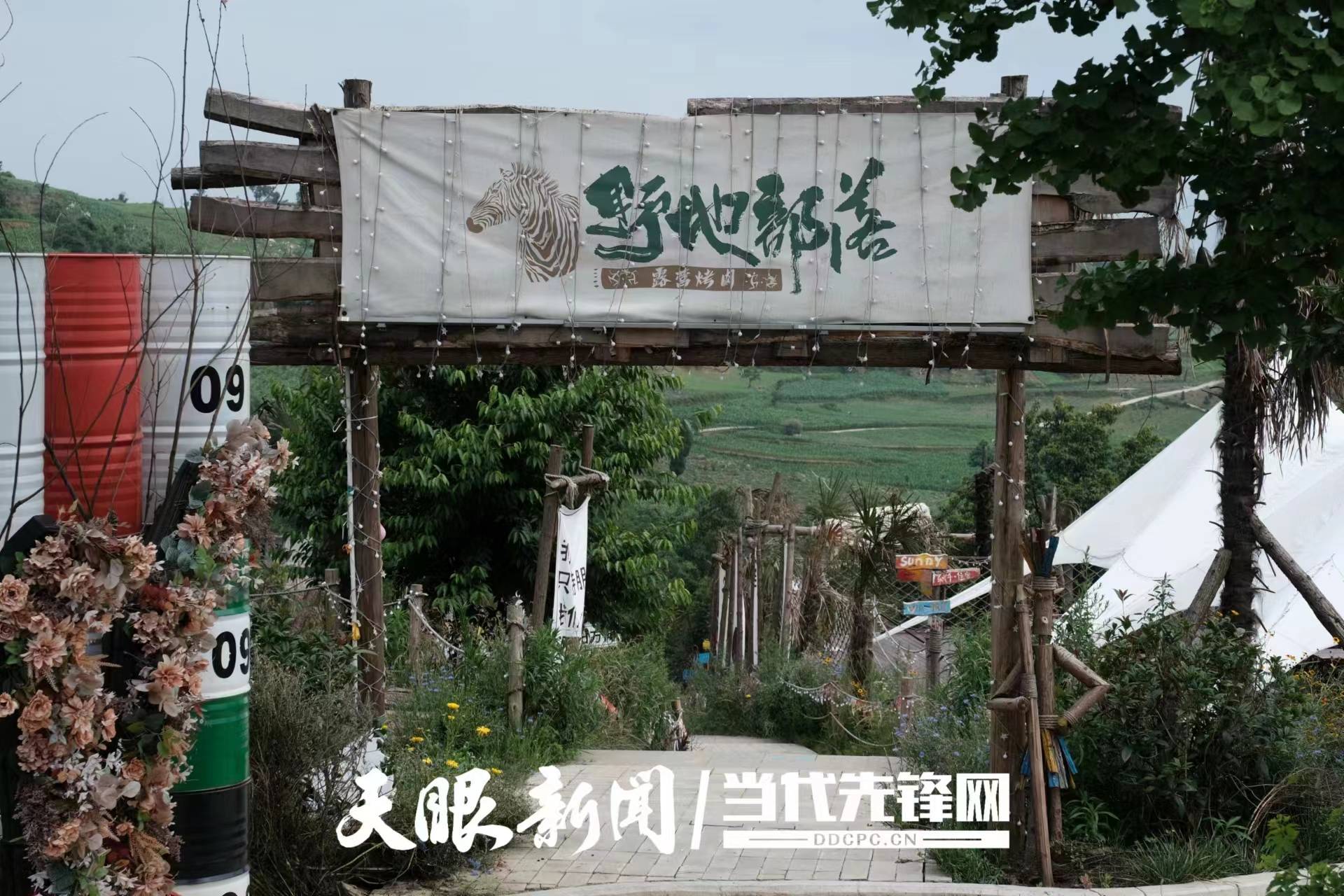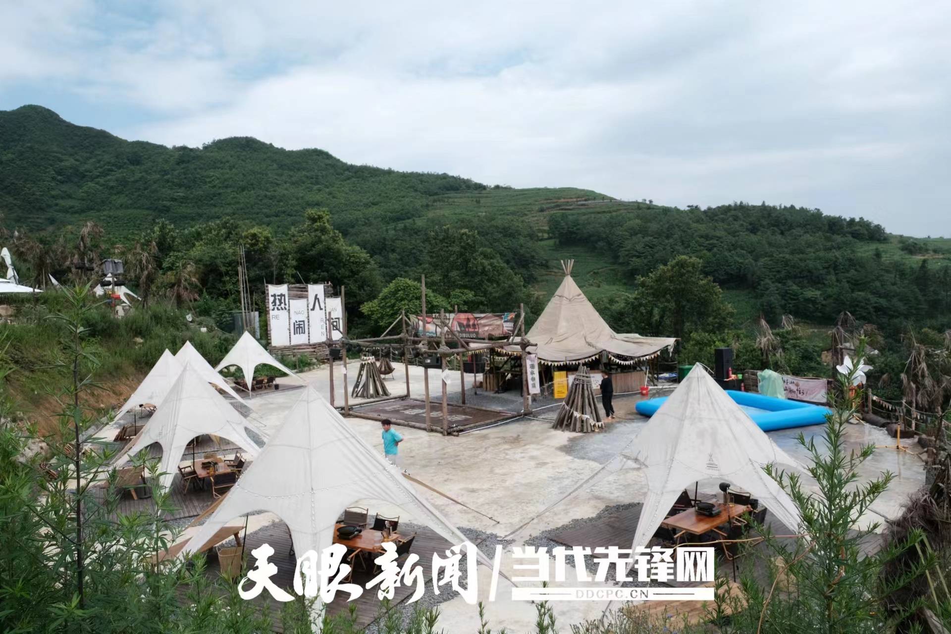 景区的野地部落露营基地内,村民熊应梅和几名服务人员正在擦拭桌面、清洗杯盘,为即将到来的客人准备晚餐。一旁,她的丈夫黄元鹏正在冲洗地面。自今年3月露营基地正式运营以来,熊应梅夫妇二人就一直在这里工作。“生意还可以,晚上很忙。”熊应梅说。