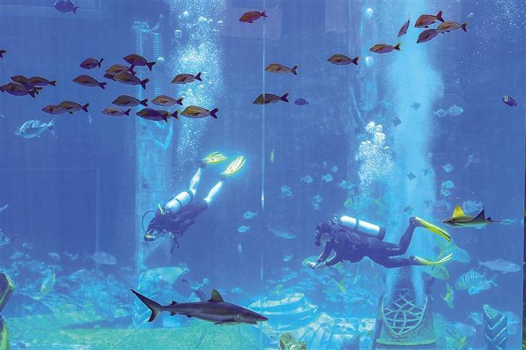 在三亚·亚特兰蒂斯水族馆,青年游客在水中与鱼儿伴游。 王程龙 摄
