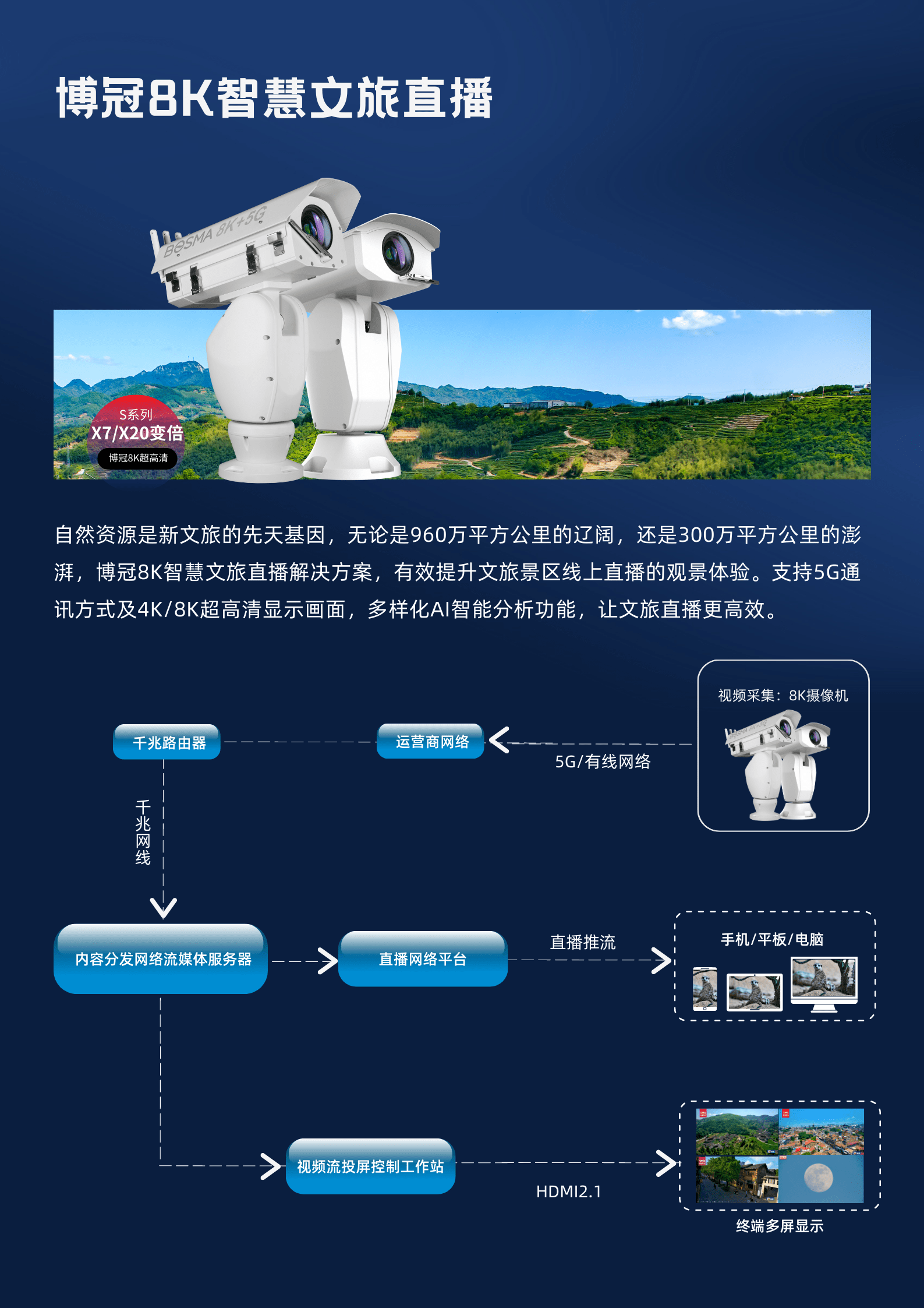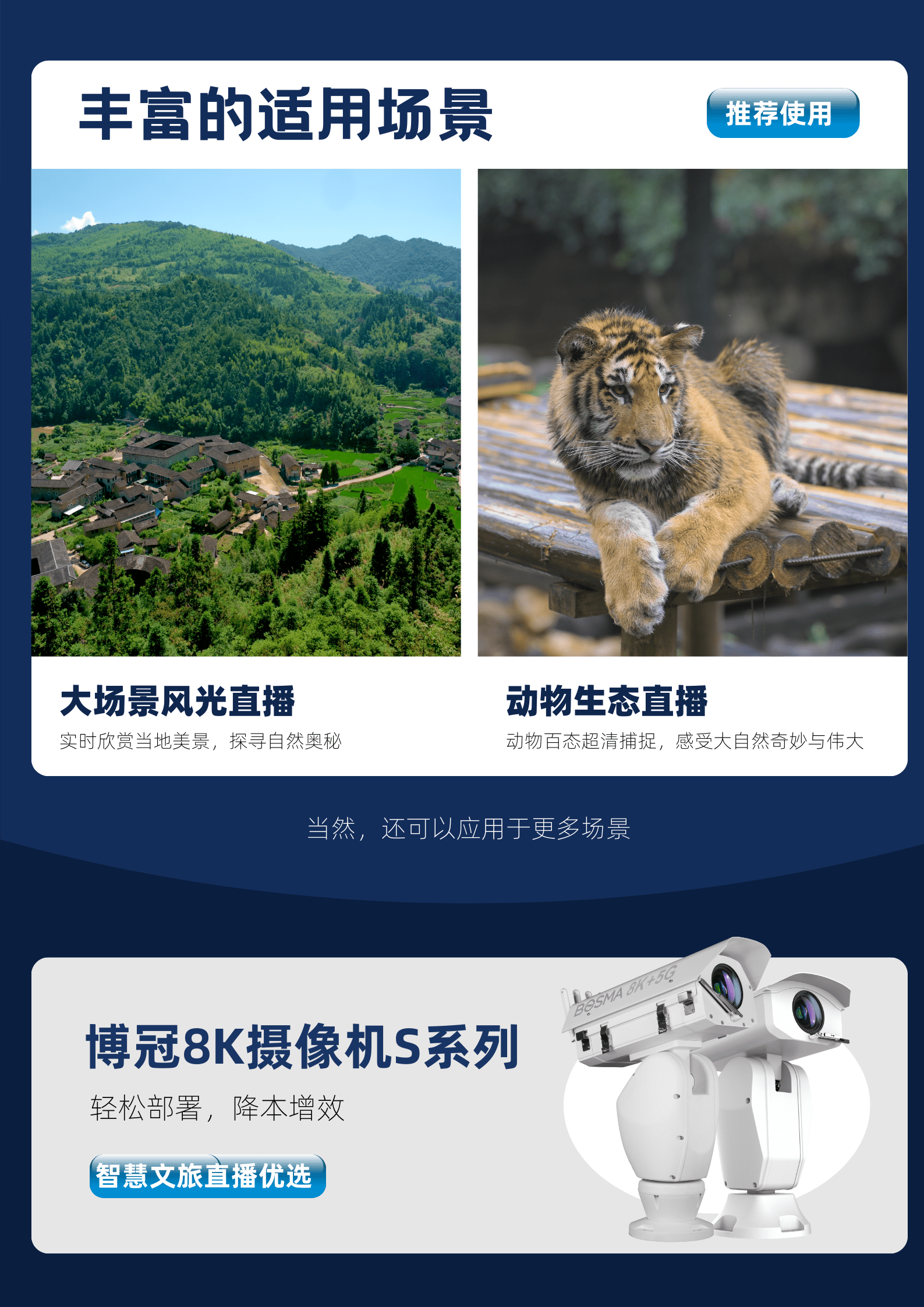 5G传输快人一步,无网场景轻松部署:因景区各有不同特性,部署需求大不相同。博冠8K支持有线、5G无线两种部署方式,可根据景区现状及要求进行定制化选择。其中,无线部署可节约大笔布线成本,避开景区复杂环境,减少人力物力支出,让景区直播价值最大化。