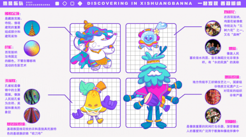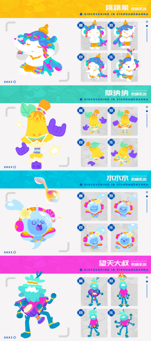 同时,POPIC极刻团队还积极响应「把西双版纳建设成为非遗特色文旅融合示范区」的政策,将傣族章哈、象脚鼓、傣族象脚鼓舞、傣族织锦等非遗文化融⼊其中。为了让热风乐队更好展示西双版纳的热带风情和生命力,POPIC极刻团队为每一个IP形象设计了表情系统和性格特点:热情有活力、擅长民族舞蹈的跳跳象,自带专属BGM的版纳纳,喜欢鼓捣各种乐器的望天大叔和用歌声释放魔法的水精灵。
