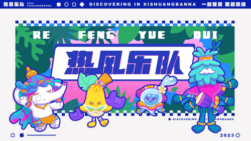 热风乐队由跳跳象,望天大叔、版纳纳和水水水组成,四个ip形象分别来源于香蕉、大象、泼水节、望天树,都是西双版纳知名元素。