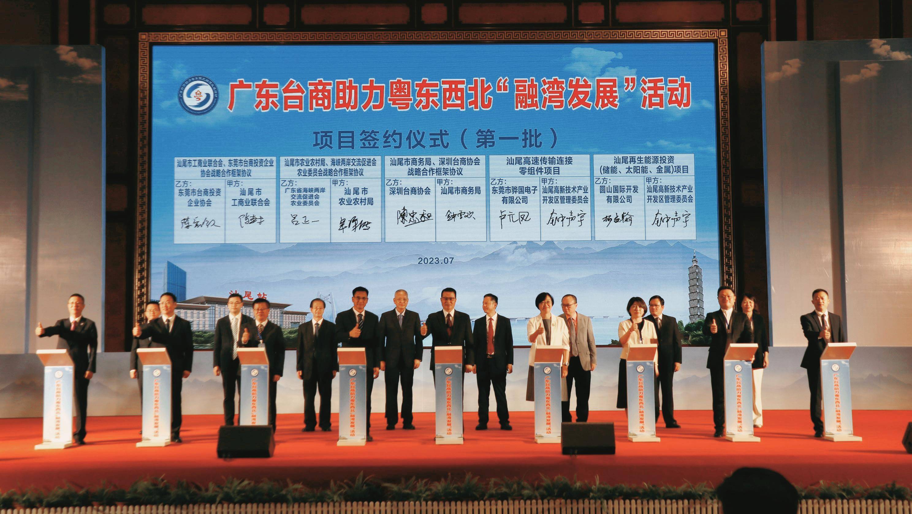 7月6日至7日,广东台商助力粤东西北“融湾发展”活动在汕尾市举办。现场举行珠三角台资有序转移粤东西北项目签约仪式,15个集中签约项目合同意向总额超17亿元,涉新能源、高端制造等产业。