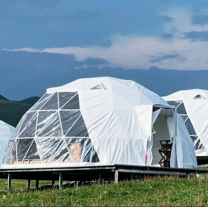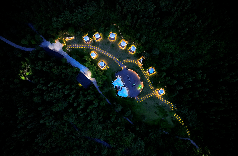 营地占地面积约60亩,分为住宿区、娱乐区、休闲区、自助露营区、餐饮区。住宿区帐篷45顶,其中轻奢帐篷38顶(18个标间、20个单间),星空泡泡屋7个。