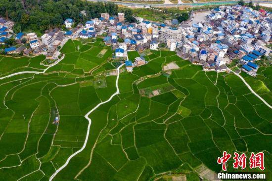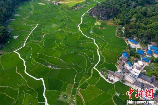 在贵州省黔东南苗族侗族自治州从江县贯洞镇,错落有致的村庄镶嵌在绿油油的田野中,与绿树、道路构成美丽的乡村画卷。图为航拍贵州省从江县贯洞镇,田野广阔景如画。吴德军 摄