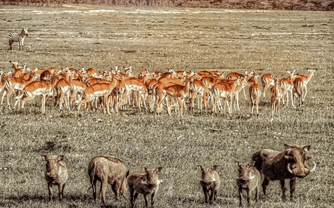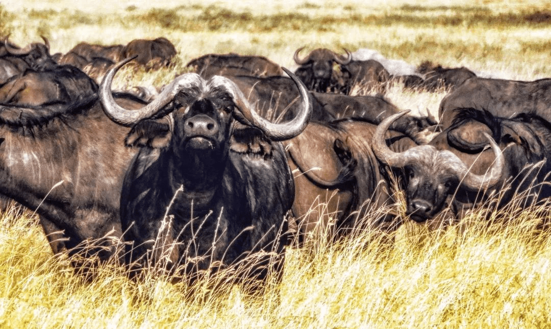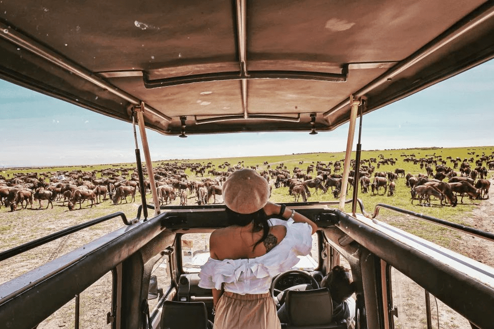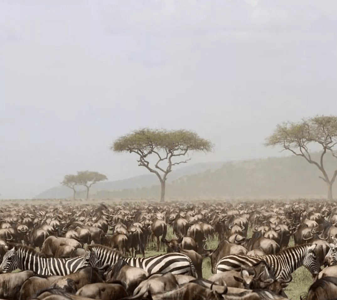 金黄色的草地上,不远处成千上万头角马、斑马、羚羊和我们是梵高画作里的精灵