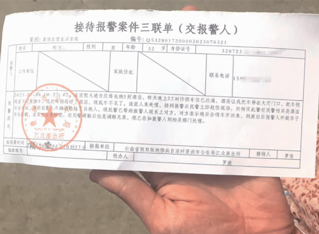 7月6日,有外地游客反映称,他们一家四口自驾到西双版纳旅游时预订了一家酒店,因当晚10点多办理入住时酒店停车位已满,酒店负责人让他们把车停在酒店门口,然后把钥匙交给酒店前台保管即可。不料次日,钥匙不见了,车也不见了……