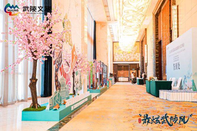 活动当天,主办方在酒店搭建了文创展区,将酉阳桃花源的元素融入到了整体展陈之中,营造了沉浸式、互动性观展体验,从大武陵9区县特色旅游地推荐、“活态传承”非遗手工艺品、精美文创好礼到天然的农特产品,在看展了解重庆文化的同时,还可以品美食。
