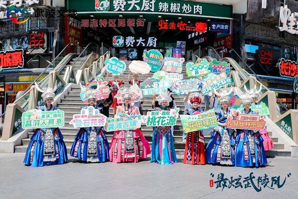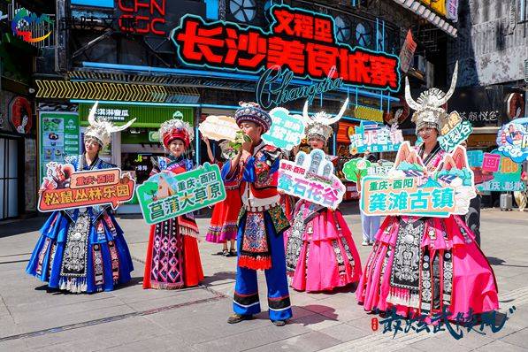 6月27日上午,来自重庆的歌舞演员身着靓丽的民族服饰,热情挥舞着手持牌,在长沙街头掀起了一场独具巴渝特色的文艺快闪,拉开了本次推介活动的序幕。活动中,演员们带来了《酉阳欢迎您》《苗乡等你来》《木叶情歌》等精彩表演,无一不展现重庆人民乐观、爽朗的天性,极具感染力,引得现场市民拍手叫好,部分市民还加入一起嗨歌跳舞。演员们手持重庆各著名景区手牌,盛情邀约湖南游客赴重庆打卡游玩,围观市民纷纷拍照,活动现场人气火爆。