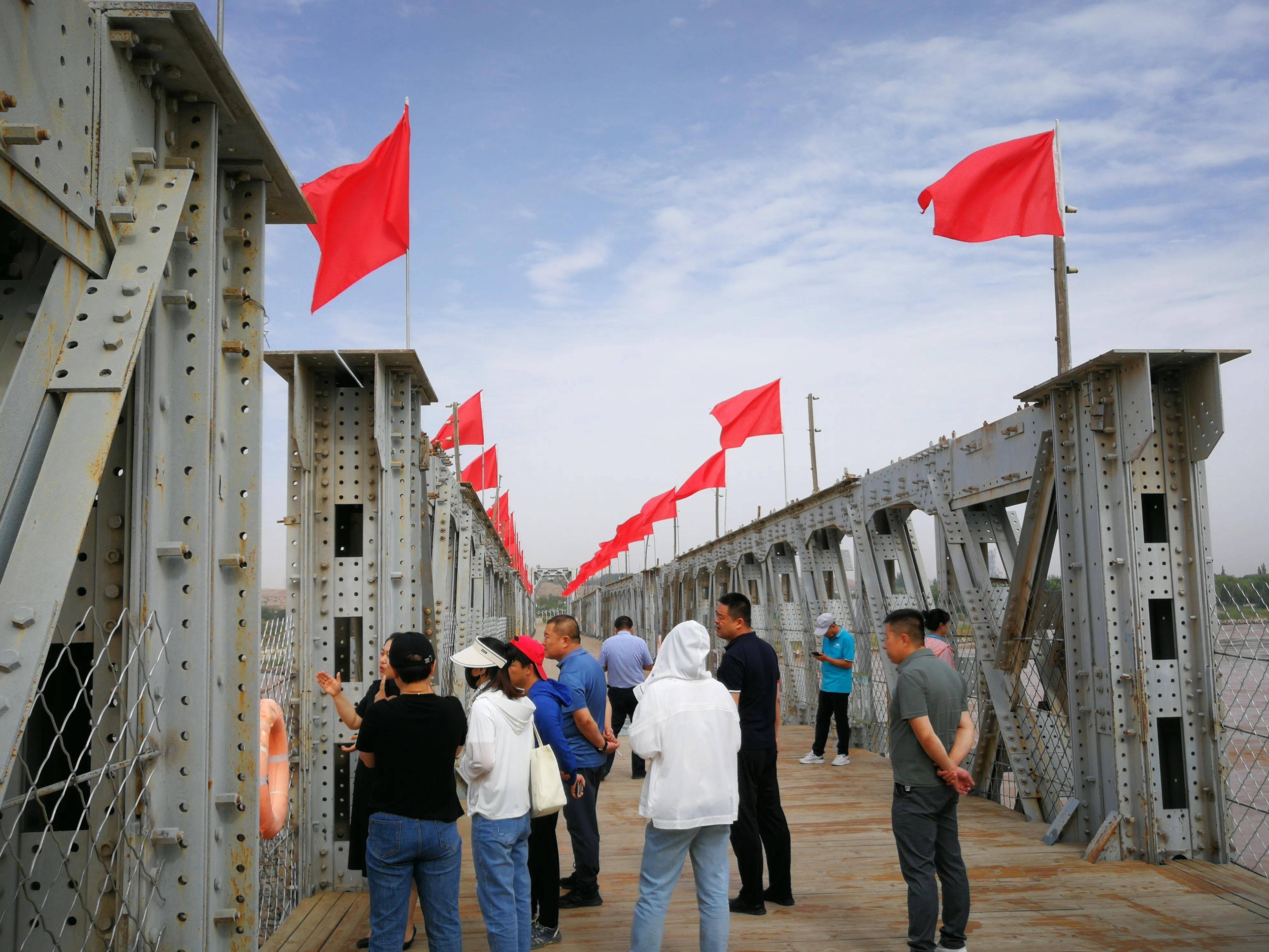 7月5日,“行走宁夏”2023年宁夏文旅融合高质量发展主题宣传活动采访团来到青铜峡黄河大峡谷旅游区黄河铁桥看到位于世界灌溉工程遗产——宁夏引黄古灌区,核心区的青铜峡黄河铁桥上红旗飘扬,桥面游人不断。
