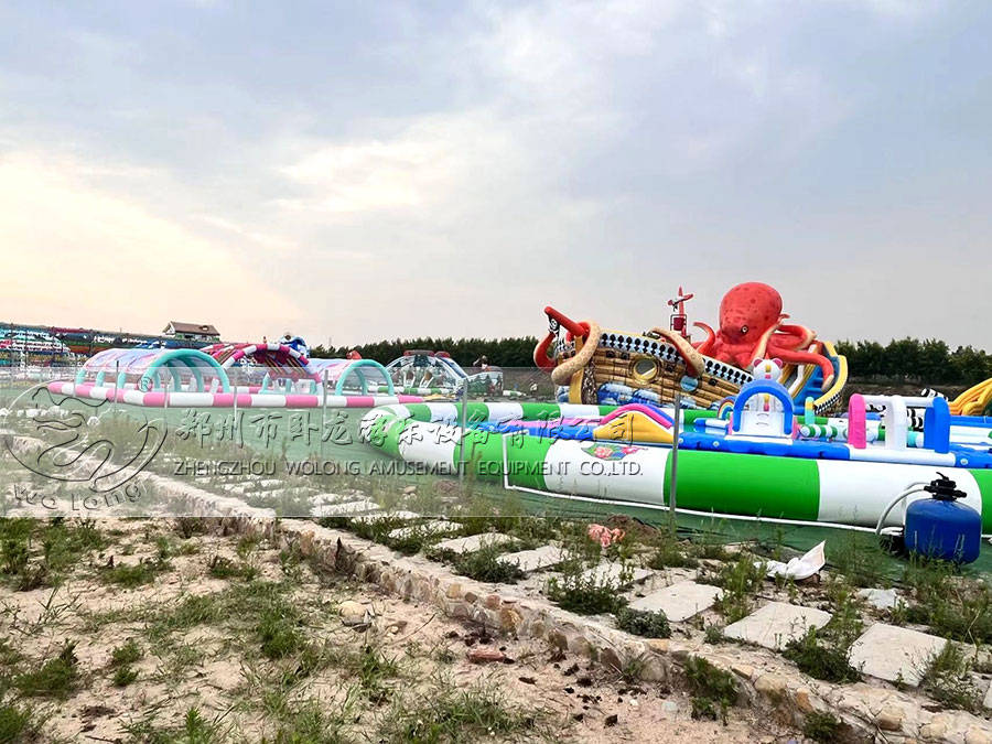除此之外,遮阳充气游泳池的包容性还很轻,里面可以摆放各种水上游乐设备,如海洋球、滑梯、蹦床、手摇船、水上滚筒、冲关设备等,多样的玩法很吸引游客!