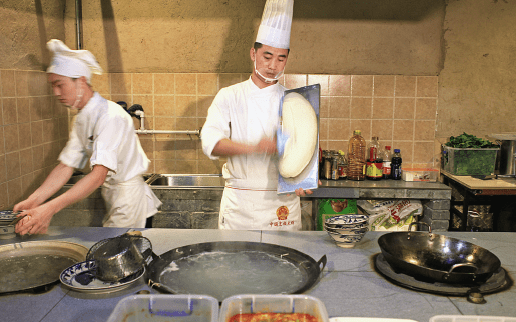 刀削面最精彩的在于那削面时的眼花缭乱,一条条面条如小鱼一样涌入汤锅内,中间后,两边薄,每段的尺寸恰好都为6寸长。虽然厨师的姿势看起来潇洒自在,但是没有多年的功夫傍身,这份技艺是一般人玩不转的。