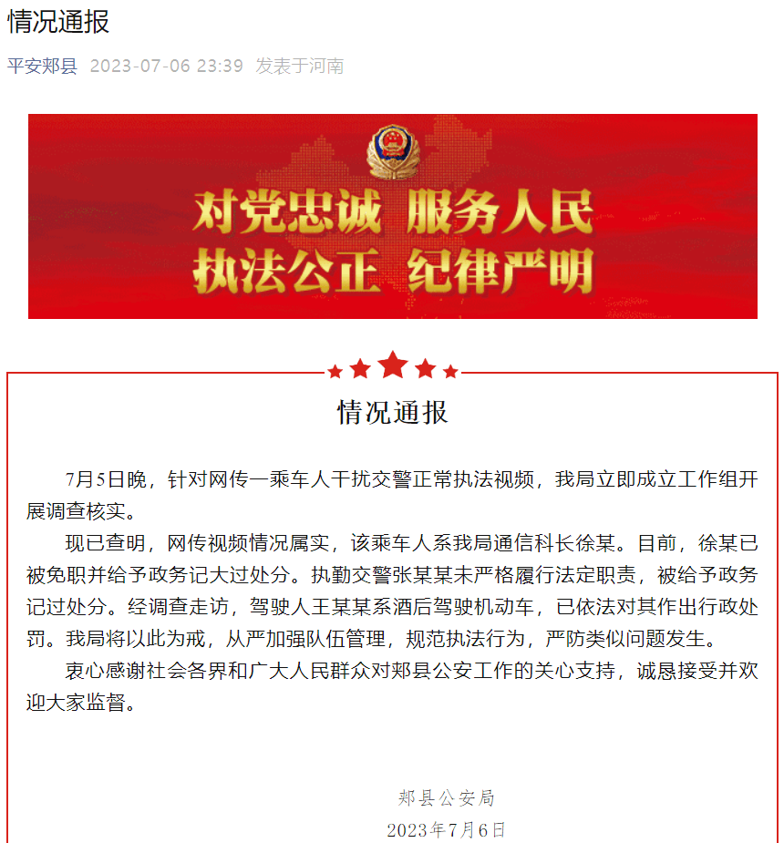 现已查明, 网传视频情况属实,该乘车人系我局通信科长徐某。目前,徐某已被免职并给予政务记大过处分。执勤交警张某某未严格履行法定职责,被给予政务记过处分。经调查走访,驾驶人王某某系酒后驾驶机动车,已依法对其作出行政处罚。我局将以此为戒,从严加强队伍管理,规范执法行为,严防类似问题发生。
