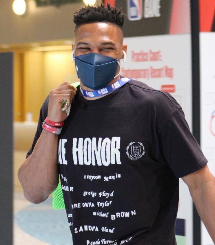 今天NBA官方社交媒体晒出了一张威少抵达迪斯尼园区的照片,他带着一副N95口罩,笑容满面,精神状态看起来不错。