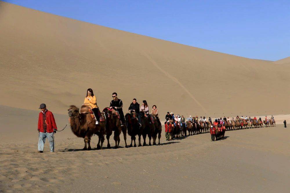 “五一”假期,敦煌旅游呈现“井喷”态势,来自四面八方的中外游客在鸣沙山月牙泉景区体验大漠风情,其中最受欢迎的便是骑骆驼,在人气最旺的时段,甚至出现了“堵骆驼”的情况,这也成了今年“五一”假期引发网友关注的新现象。