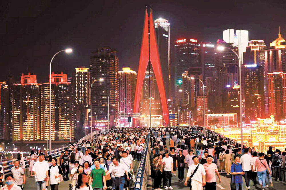 五一假期首日17时,为更好服务游客、确保交通安全,重庆市渝中区对千厮门大桥等中心区域路段实行临时交通管制,往日车流不息的跨江大桥变身横跨嘉陵江的“观景台”。