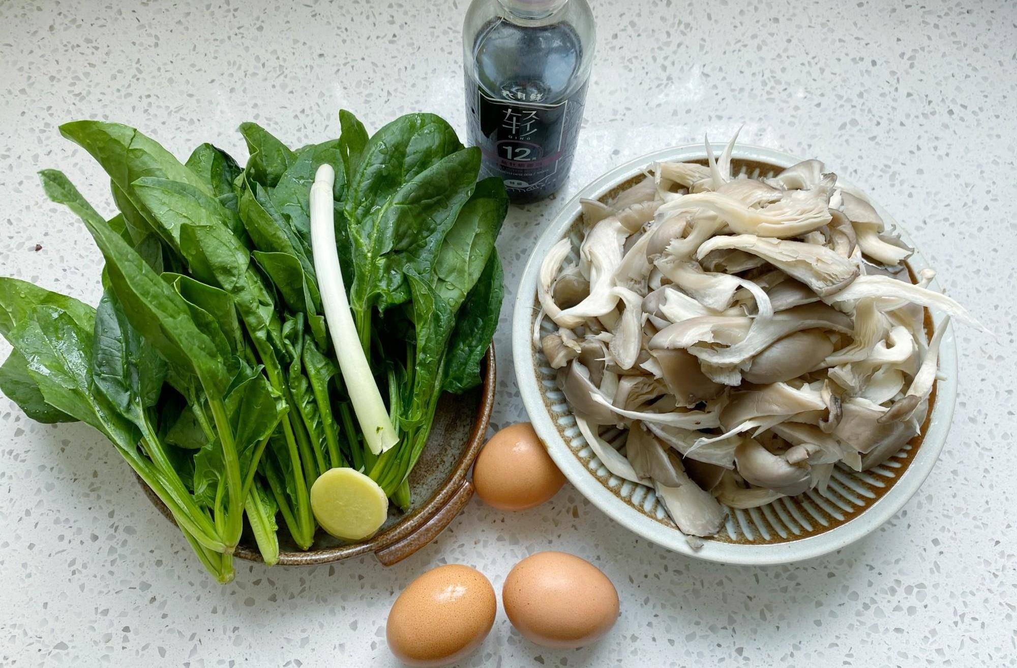 所用食材:蘑菇350克,菠菜4棵,鸡蛋3个,大葱1根,生姜1片,酱油1勺,黑胡椒粉1勺,盐少许,植物油2勺,清水适量