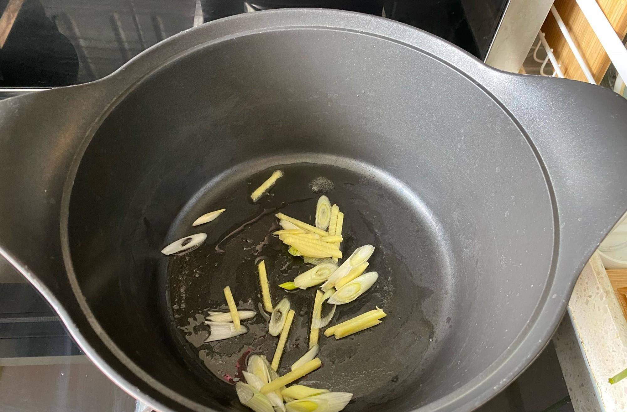 5、锅里放入2勺植物油,放入葱花和姜丝,翻炒出香味。
