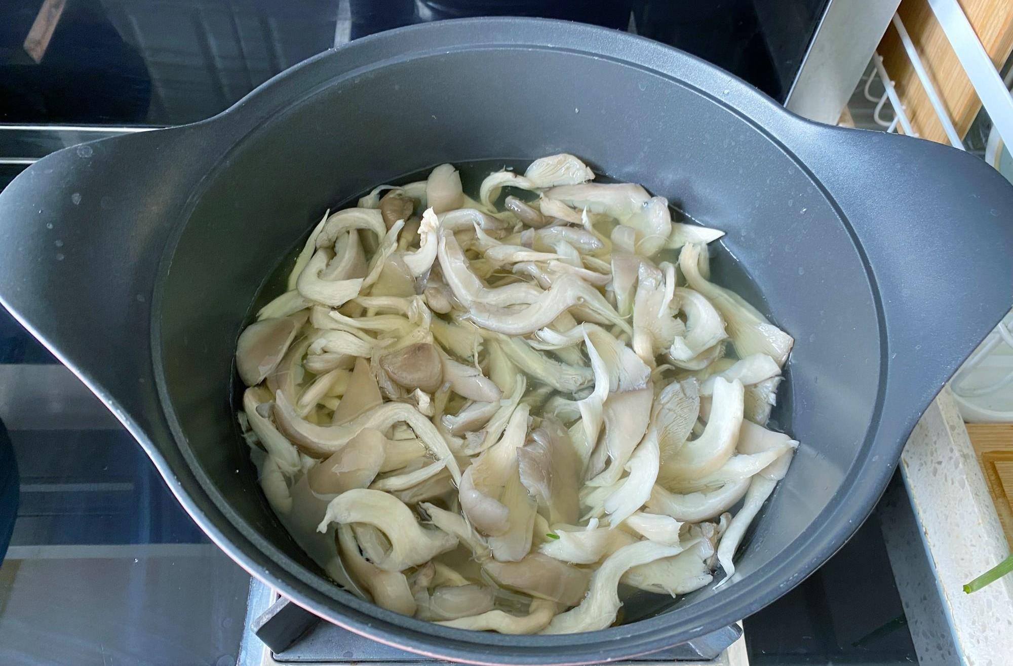 3、把蘑菇放入锅里,焯水1分钟,放凉后捏干水分装盘备用。