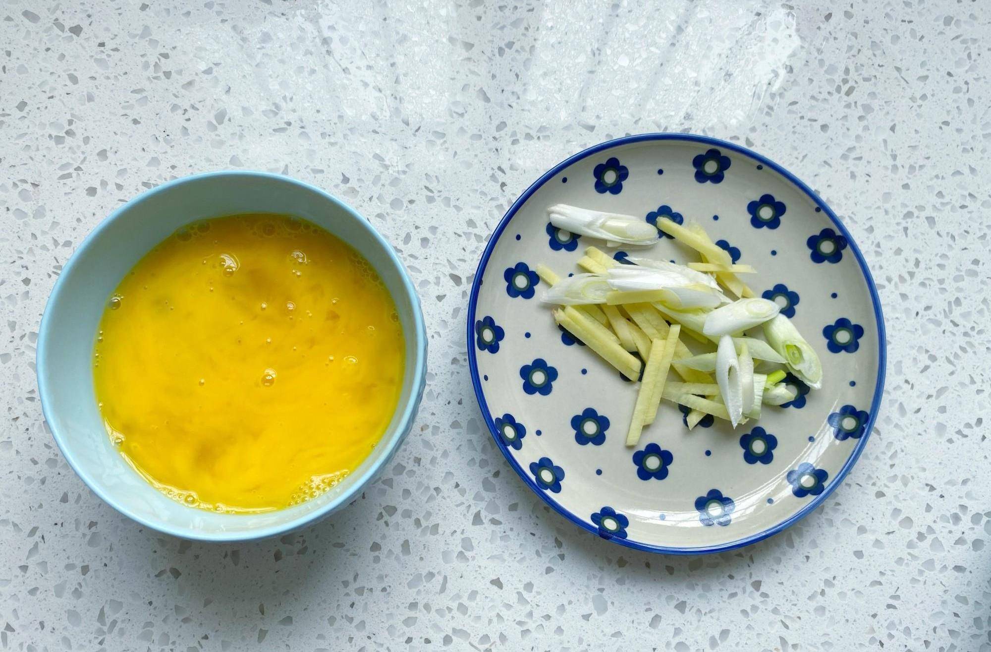 4、大葱切成葱花,生姜切成姜丝,鸡蛋加少许盐打散备用。