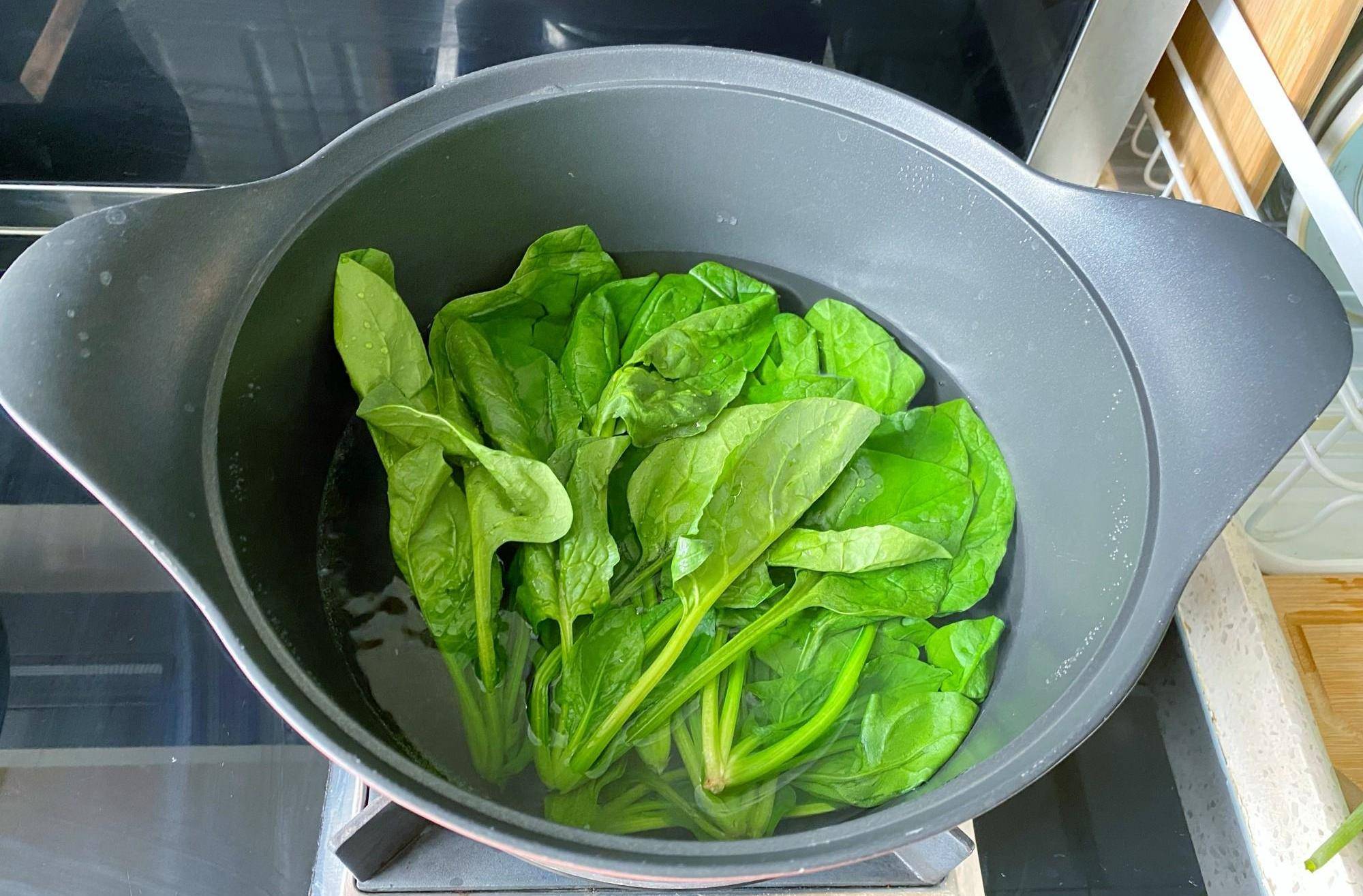 2、汤锅烧开水,放入菠菜入锅焯水10秒后,捞出沥干水分备用。