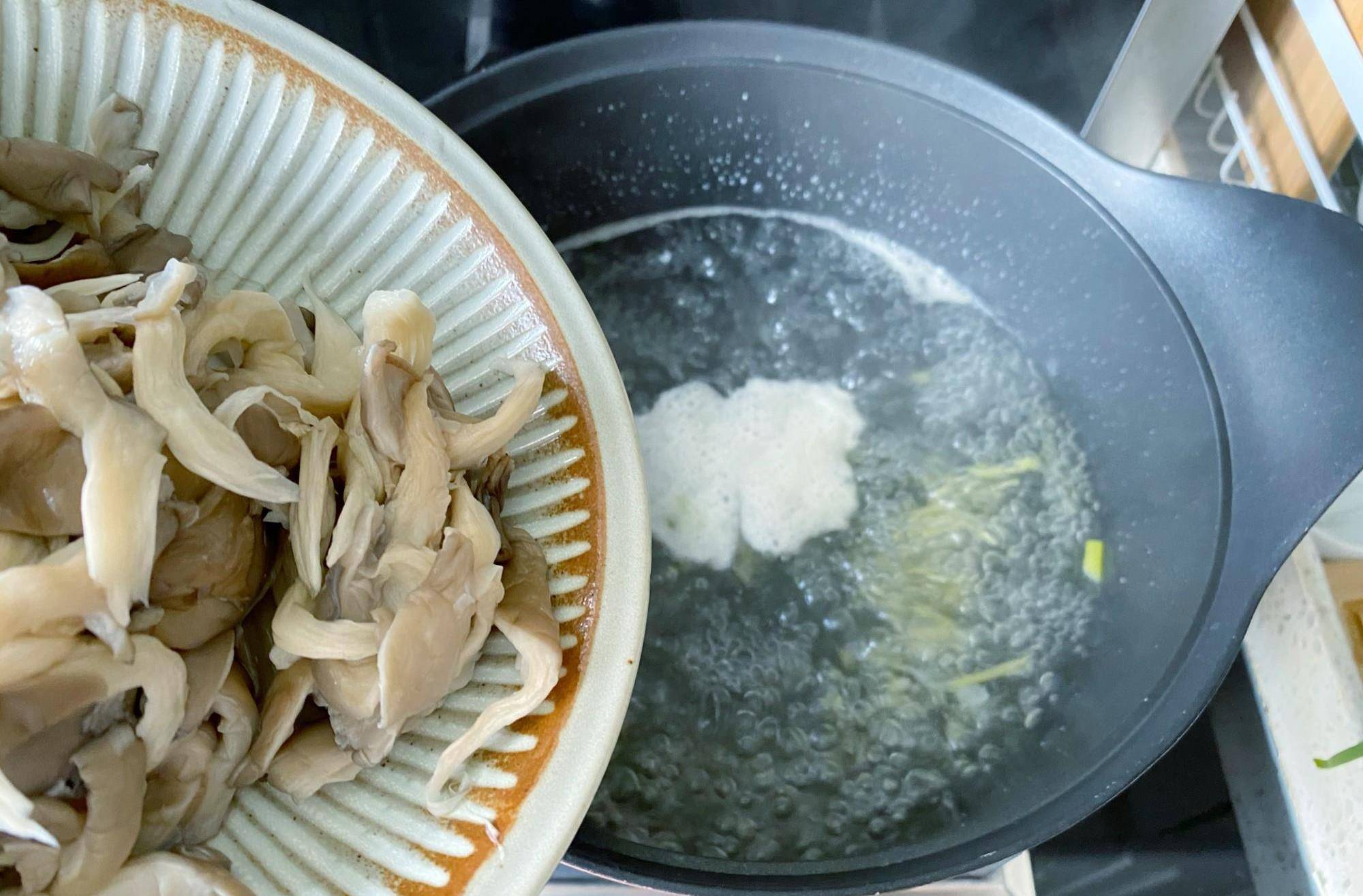 6、倒入1升清水,大火煮至沸腾后,放入蘑菇一起煮沸。