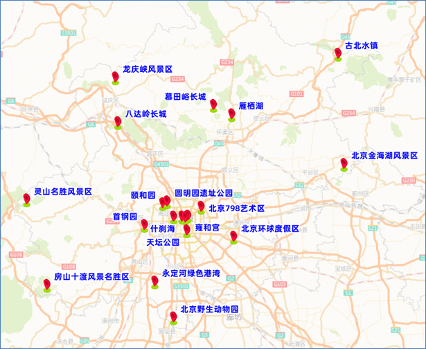 环球度假区、八达岭、古北水镇、雍和宫、颐和园等热度较高,八达岭野生动物园、八达岭水关长城等景区距离较近,京藏高速八达岭段和部分出口可能出现短时车辆排队的情况。
