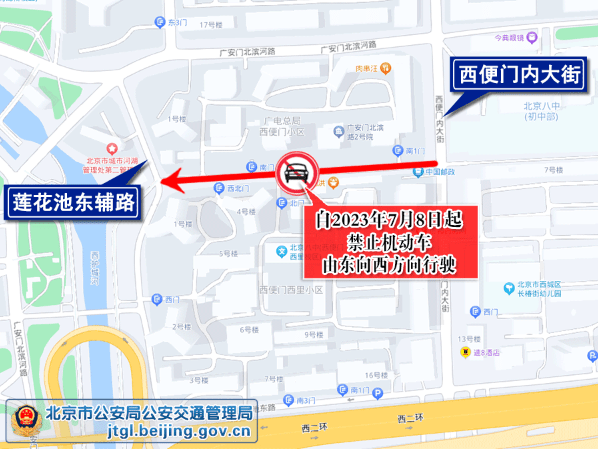 为保证西城区西便门西里小区北侧路交通安全有序,根据道路交通安全法律法规有关规定,决定自2023年7月8日起,西便门西里小区北侧路(莲花池东辅路至西便门内大街)禁止机动车由东向西方向行驶。