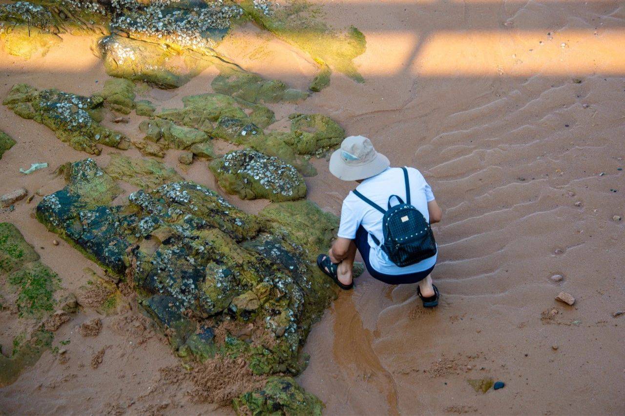 毕竟下午的阳光有点“毒”,不少人就把“阵地”转移到岸边的高墙之下,借着阴影的遮挡,扣扣这里的石缝,搬搬那里的大石头,也不知道会收获什么,大概更注重的只是“赶海”那种感觉。