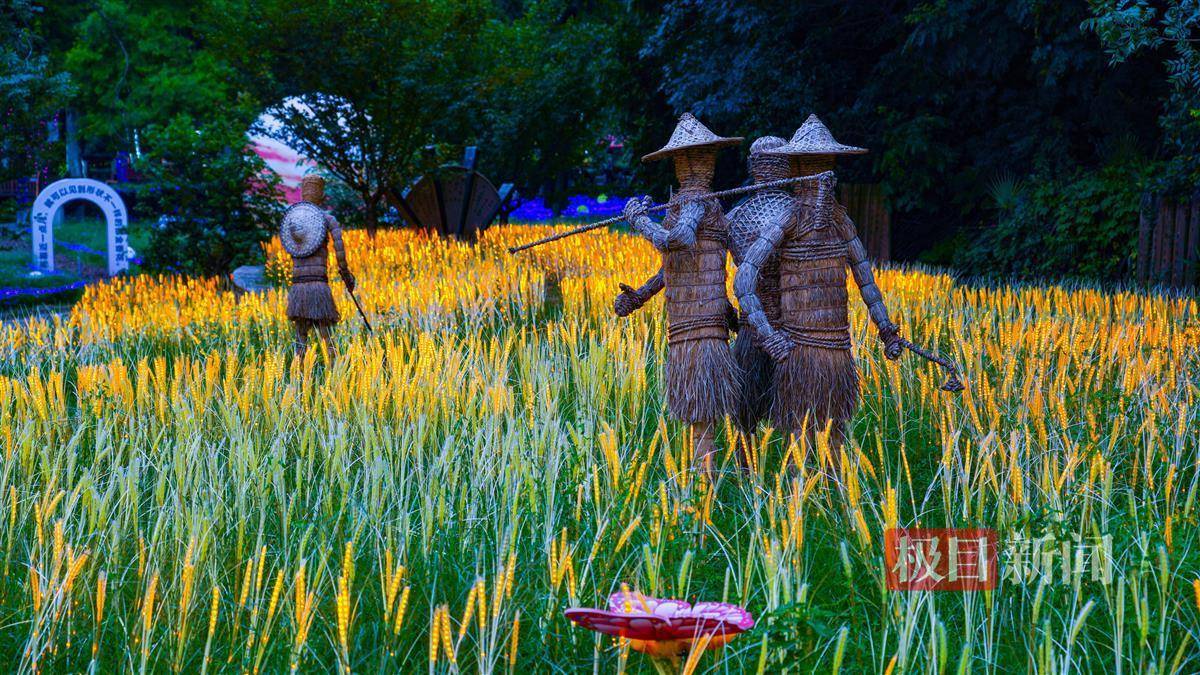蓝色星空一侧,金色麦田的璀璨光芒穿透夜空。几万颗明亮温暖的麦穗灯“种”成“麦穗原野”,麦浪翻涌,金色光芒耀眼夺目,还有几个耕田的稻草人形态逼真。