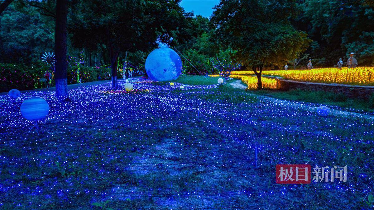 夜色中步入植物园,草坪和绿地植被被一道道彩灯点亮,就像星空投影在了大地上。