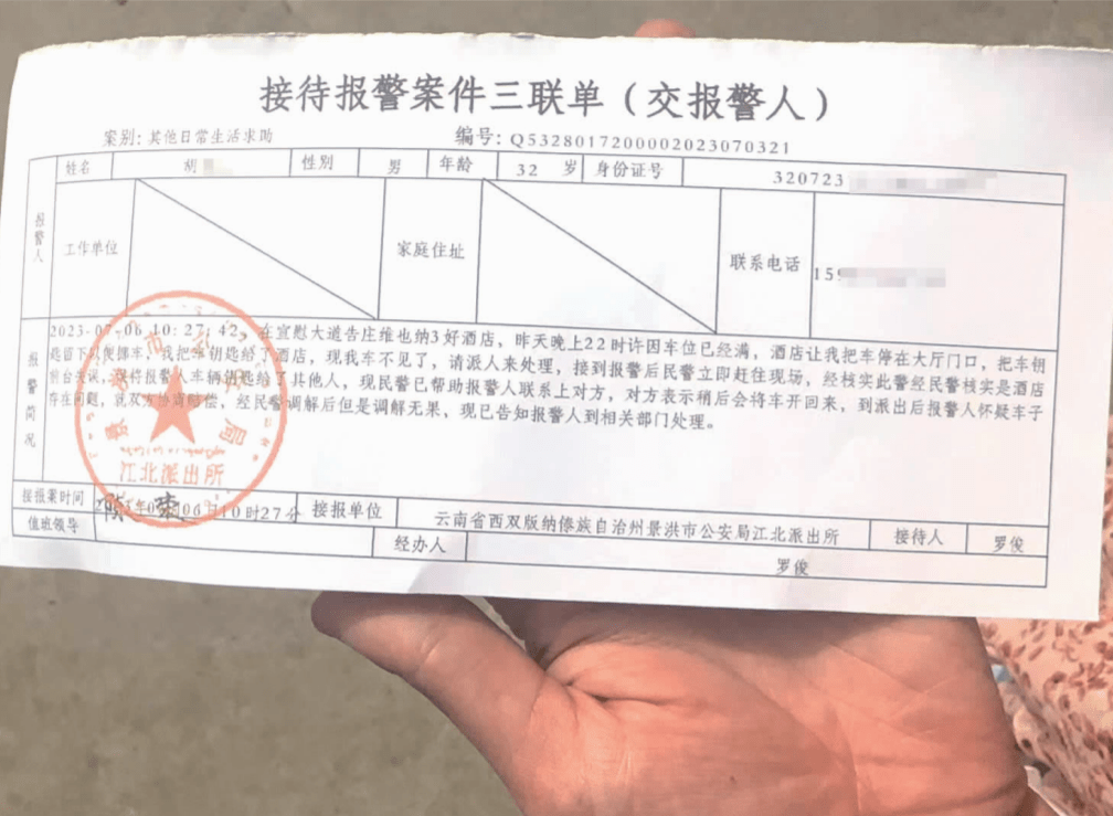 7月6日,有外地游客反映称,他们一家四口自驾到西双版纳旅游时预订了一家酒店,因当晚10点多办理入住时酒店停车位已满,酒店负责人让他们把车停在正门口,然后把钥匙交给酒店前台保管即可,不料次日,钥匙不见了,车也不见了……