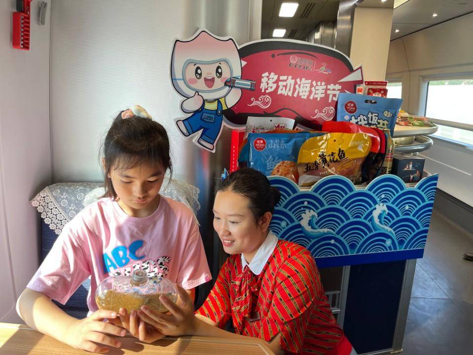在G1048次高铁列车上,河南小旅客贾欣悦拿着一个DIY景观瓶爱不释手,“这个里面有小螃蟹,还有水母,它们游来游去太可爱了,我第一次这么近距离的看到水母!”餐车工作人员张倩向小旅客讲解海洋知识,展示景观瓶玩法,引来小朋友围观。