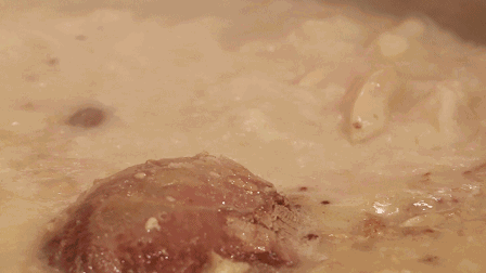 大火煮至沸腾,使汤汁从外向内翻滚循环,内敛融合后,