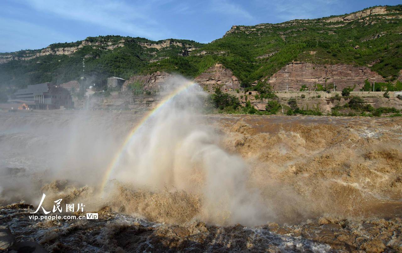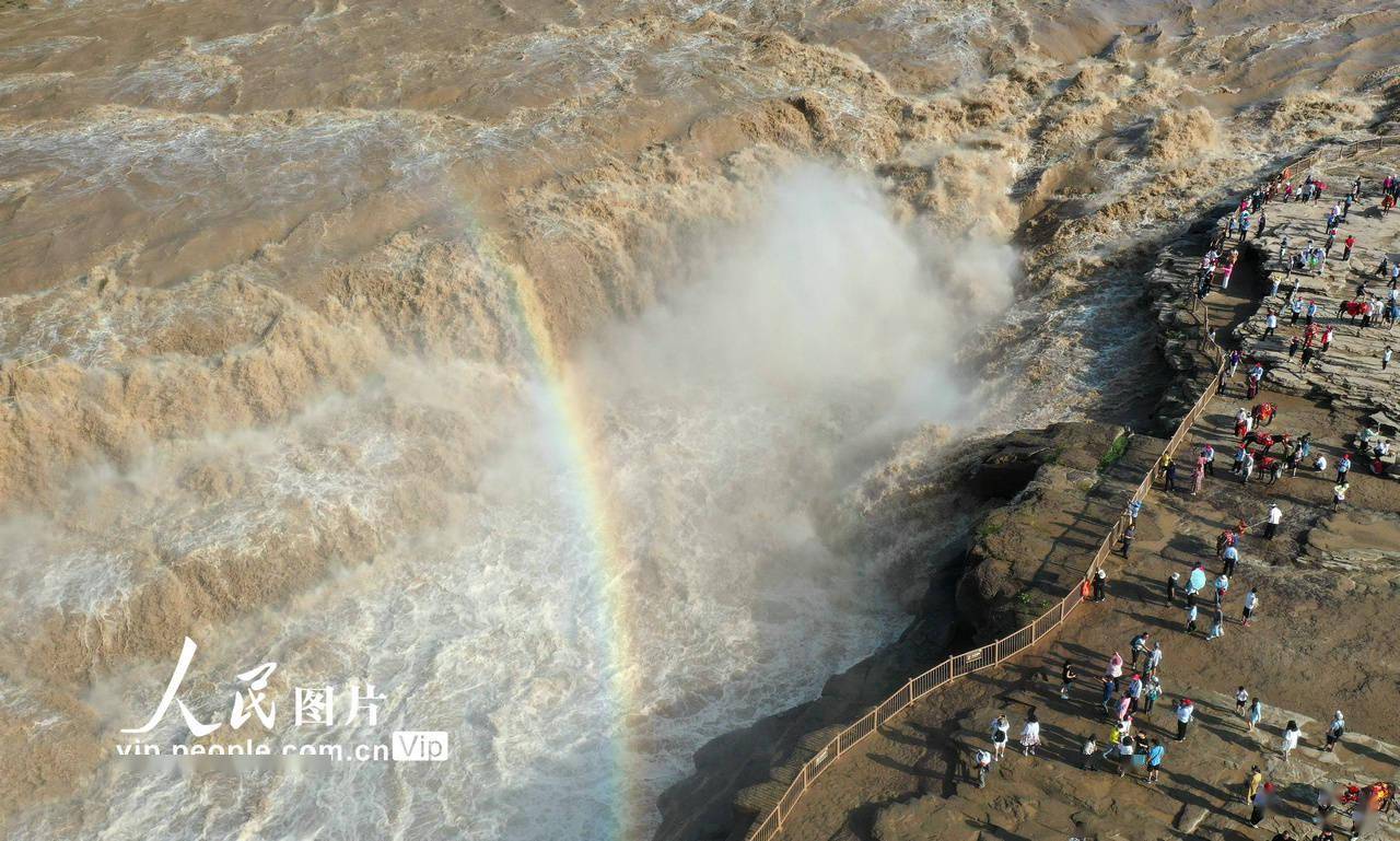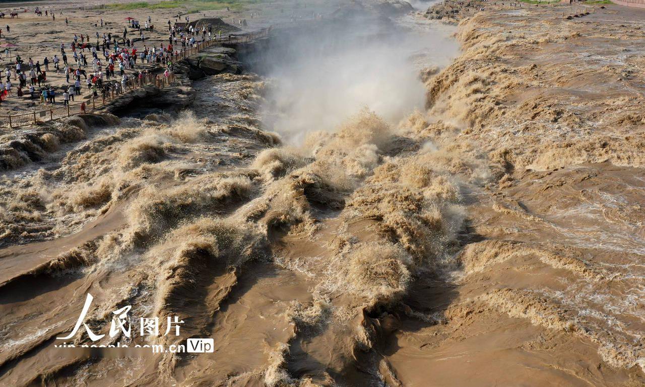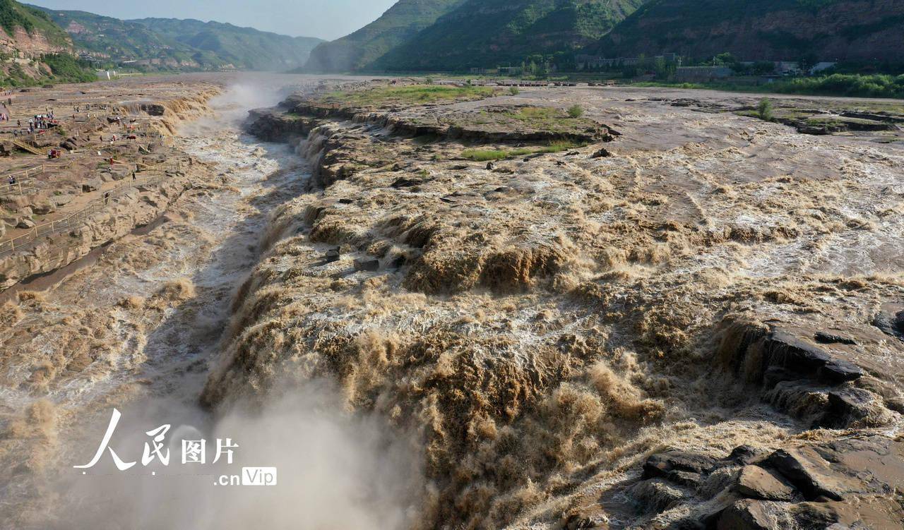受近期上游降雨增多和万家寨水库调节放水影响,黄河干流迎来主汛期,位于山西吉县和陕西宜川县交界的壶口瀑布水量大增,形成壮美瀑布群景观,吸引了众多游客。吕桂明摄(人民图片网)