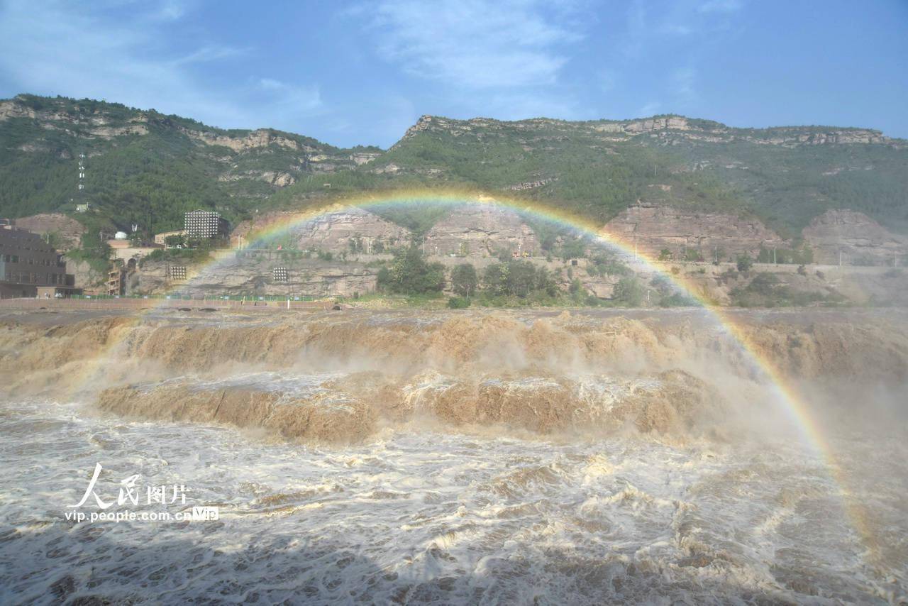 2023年7月7日,在山西吉县黄河壶口瀑布旅游区拍摄的彩虹景观。