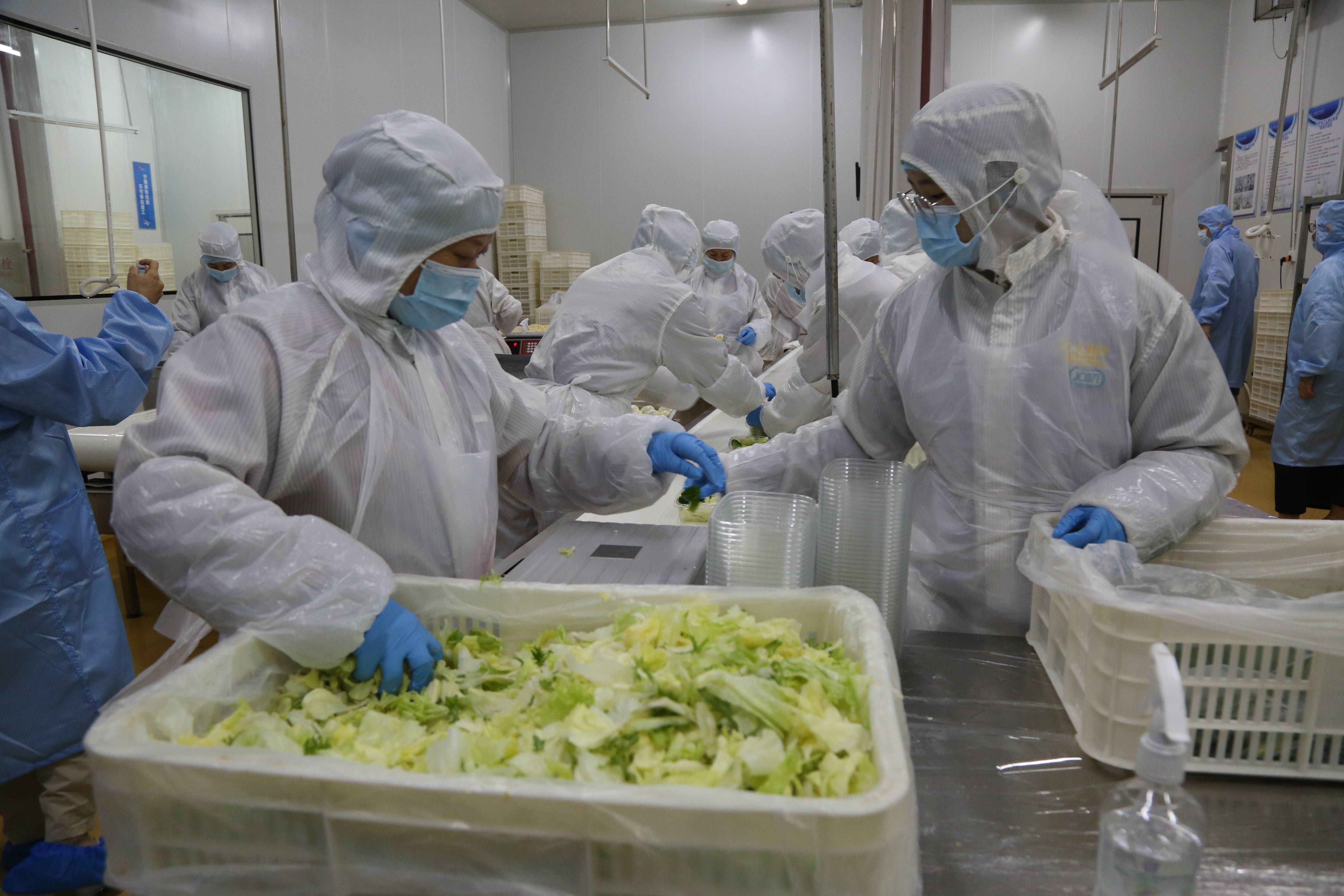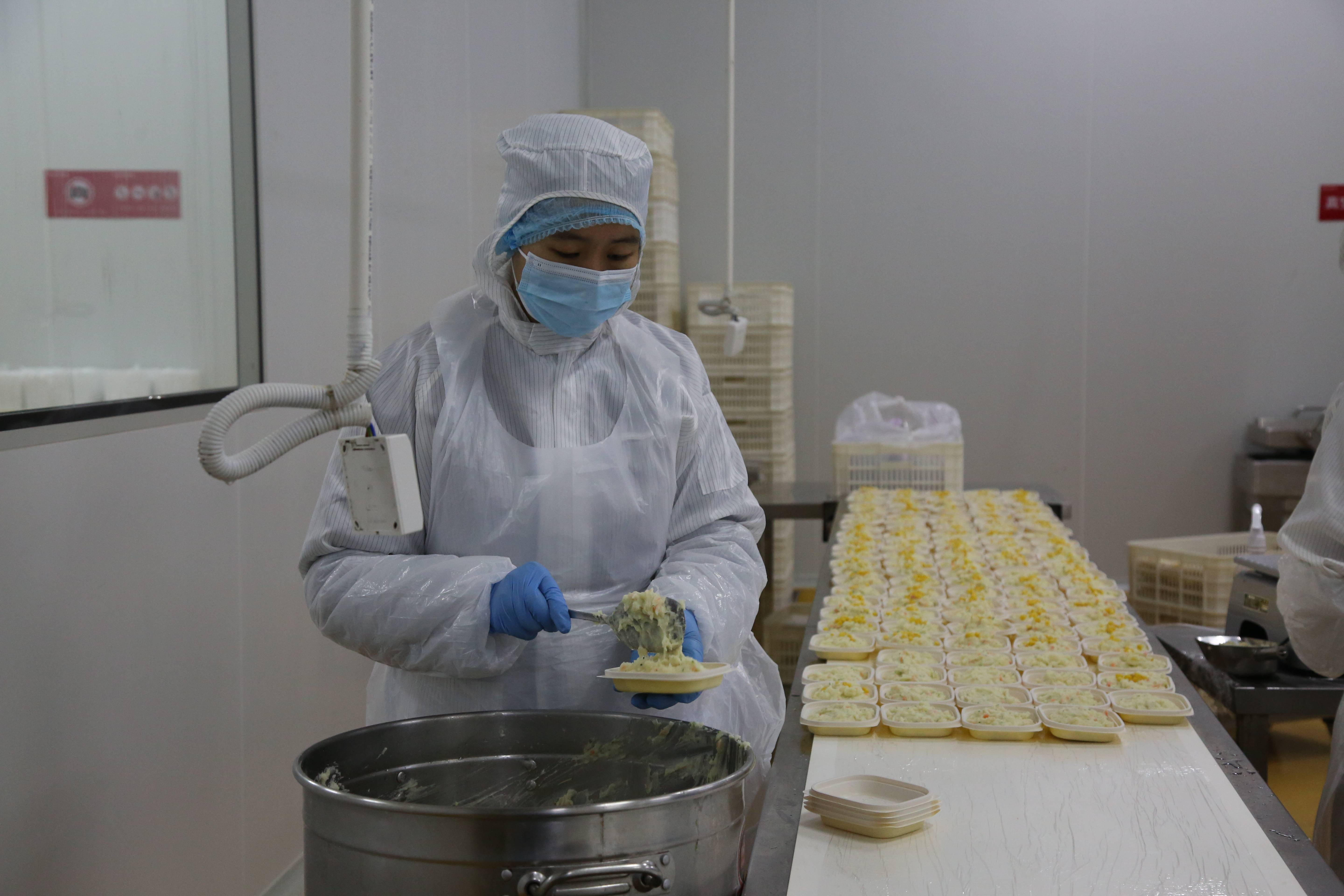 穿上无菌工作服,戴上头罩、帽子、口罩,经过全身消毒处理以后,媒体考察团成员一起进入了室温为10℃的中央大厨房操作间。先后看到了所有食材的集中处理、清洗、搭配、烹饪,以及流水线上的预制菜配制、分装等全过程。