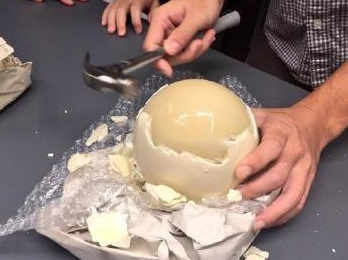 我们坐下没多久就看到厨师在拿一个小锤子敲蛋,这个鸵鸟蛋真的特别大,我还是第一次见到这么大的蛋,以前只是听说鸵鸟蛋比较大,还没有真的见识到,今天算是大开眼界了,剥蛋都要拿着小锤子敲才能打开,而且感觉蛋里面还有点偏黄,不像鸡蛋那么的白,看着就很好吃的样子。