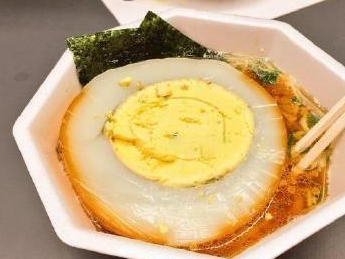 这个是我的拉面,我已经很努力了,但是我还是只能吃一少半的鸵鸟蛋,感觉有点浪费啊,说是拉面我这个里面基本上都看不到拉面了,只吃蛋黄我都吃不完,听说老板说之前还有人一口气吃了2个鸵鸟蛋呢,我真的是很佩服他,是怎么吃完的,我觉得我饭量也不小啊,你们能吃完一个鸵鸟蛋吗?