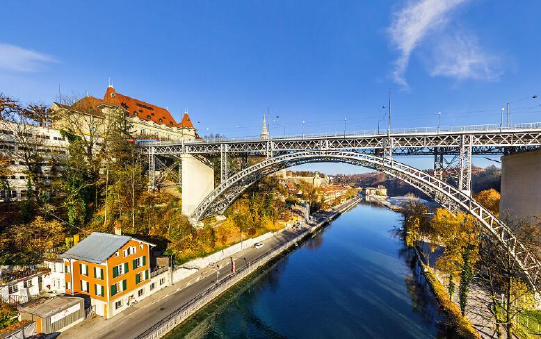 从不同角度去看瑞士这座桥,你会发现远近、高低、俯仰等不同角度的观看都会不同,这桥会给你不一样的视觉冲击。图为这座桥的鸟瞰图,这样看这座桥气势磅礴,倘若从桥上俯瞰水中桥的样子就像一轮水中弯月。