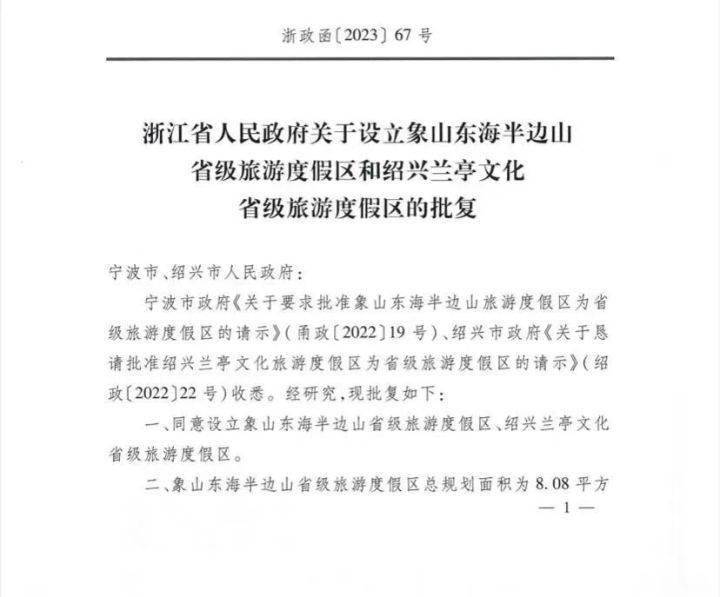 7月7日,记者从宁波市文化广电旅游局获悉,浙江省人民政府于近日发布《浙江省人民政府关于设立象山东海半边山省级旅游度假区和绍兴兰亭文化省级旅游度假区的批复》,同意设立象山东海半边山省级旅游度假区。