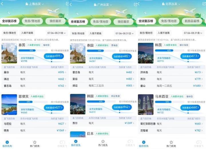 以热门客源地机场数据来看,根据携程数据,截至7月5日,暑期上海虹桥机场出发国内机票均价为1306元、出境机票均价为1563元。而对于热门长线目的地,根据携程数据,截至7月5日,暑期乌鲁木齐国内到达机票均价为1877元、喀什国内到达机票均价为1406元。而查看携程APP可以发现,暑期前往东南亚百元机票仍十分充足。